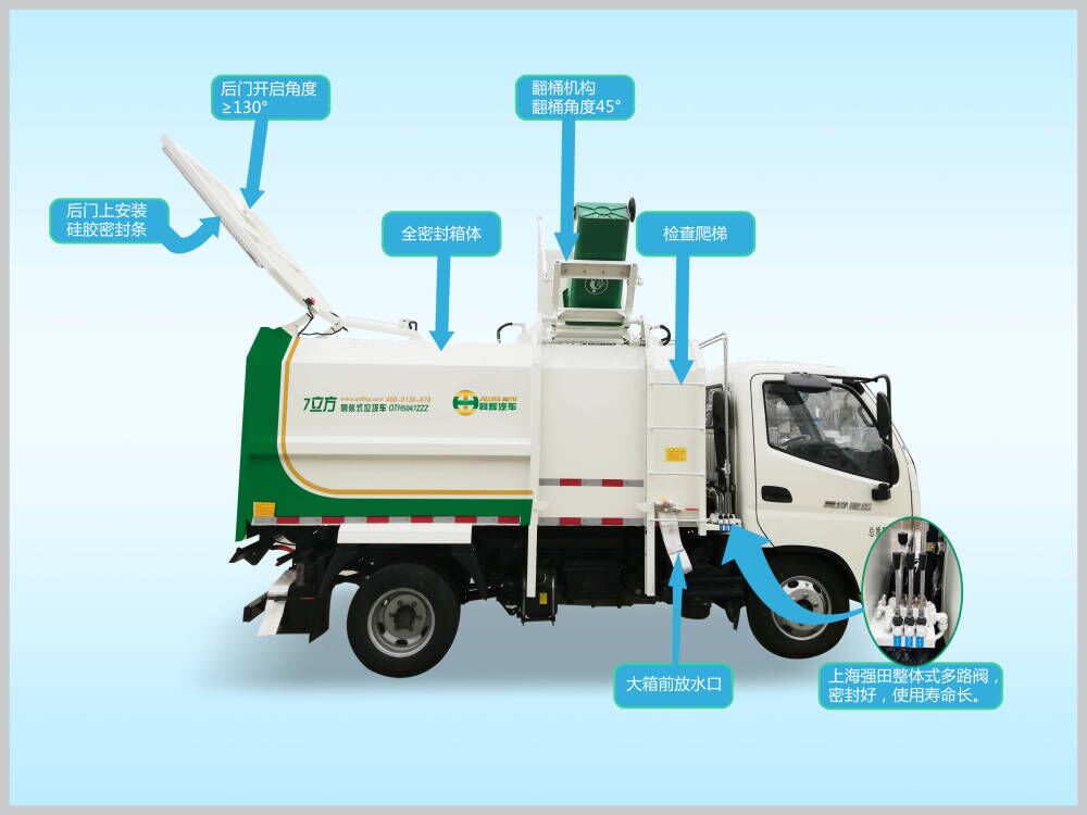 2、为减少污水的洒漏,在大箱后部设有防洒漏装置。